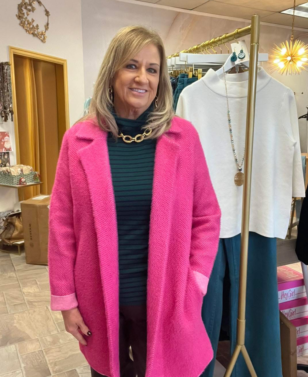 This open-front coatigan in deep raspberry pink brings warmth and vibrancy to any look. Designed with a double notch collar, long sleeves, and seam pockets, the soft knit drapes beautifully for easy layering. The perfect piece to add a pop of color to your wardrobe.