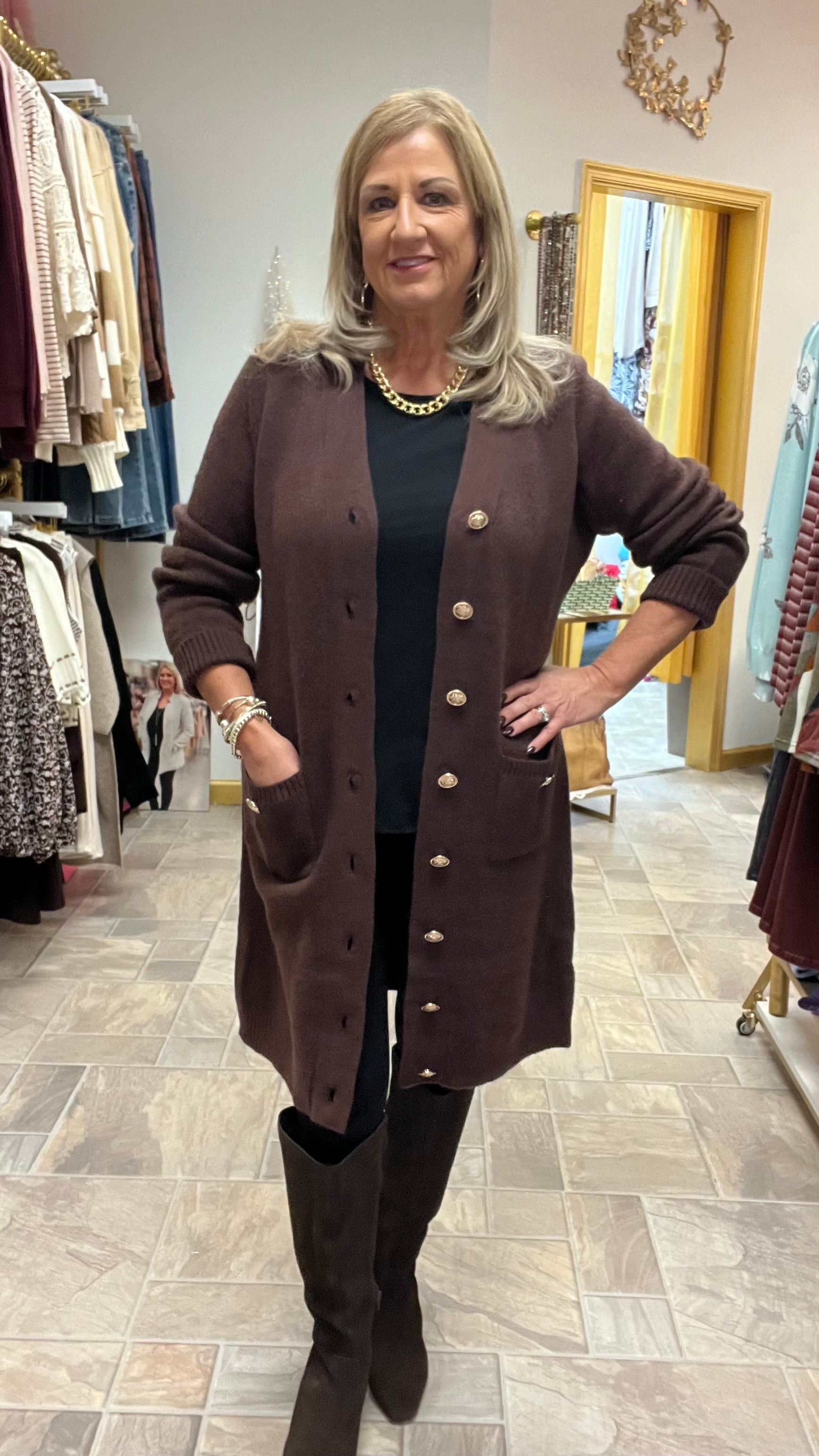 This Brown Dress Cardigan is your new go-to for cozy style with a playful twist. Featuring a flattering v-neck with wide ribbed trim and gold-tone buttons down the front, it adds a touch of sparkle to your everyday look. Keep little essentials close with front pockets, and enjoy snug ribbed cuffs that keep the chill at bay. Perfect for layering and stepping up your casual wardrobe!