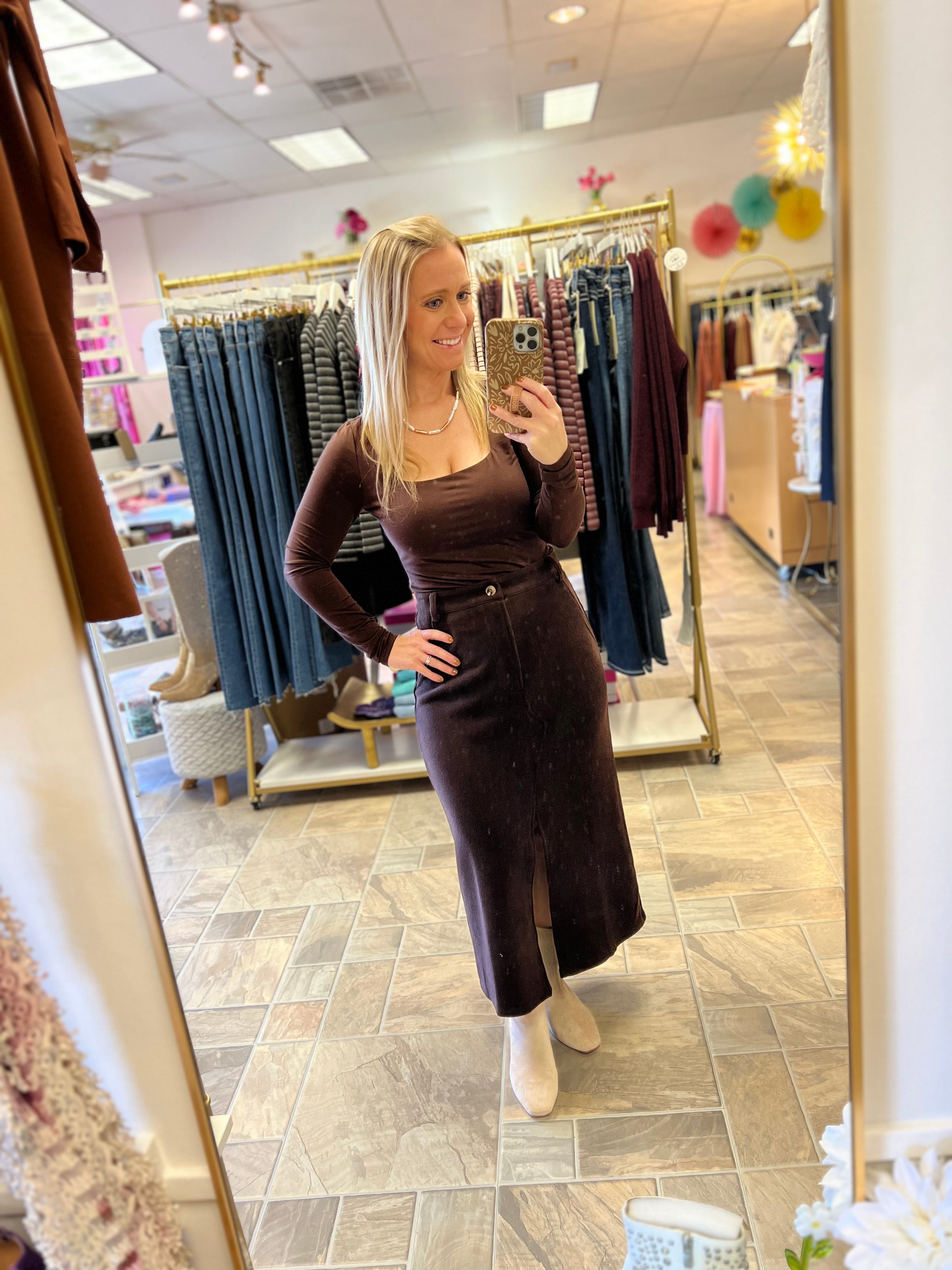 Embrace retro charm with this playful corduroy midi skirt. Its soft, textured fabric adds cozy style, while the front slit brings just the right amount of flair. The button and zipper closure ensure a perfect fit all day long. Perfect for twirling through your day with confidence and comfort!