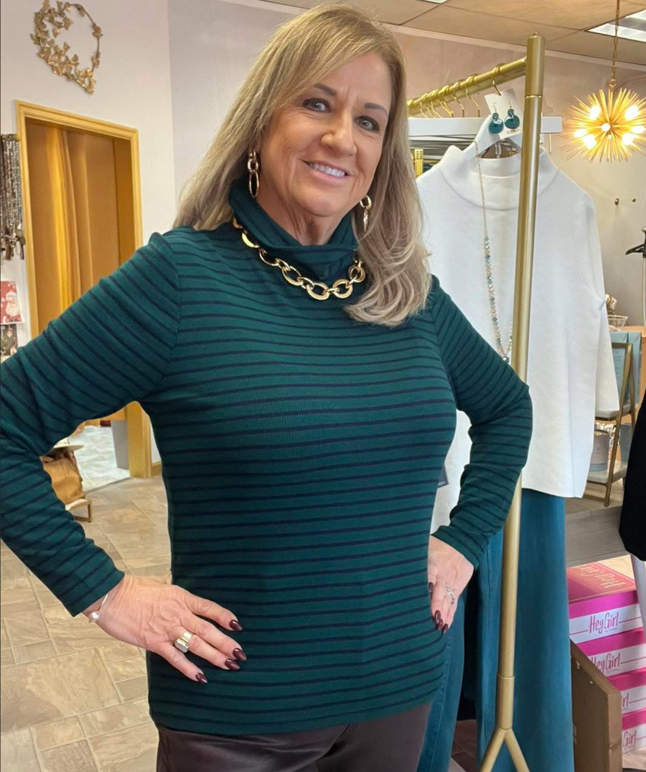 This long sleeve turtleneck knit top in emerald navy stripe features a foldover neckline and clean straight hem. Soft, comfortable, and versatile, it adds an elevated touch to any look whether worn on its own or layered under your favorite jacket.