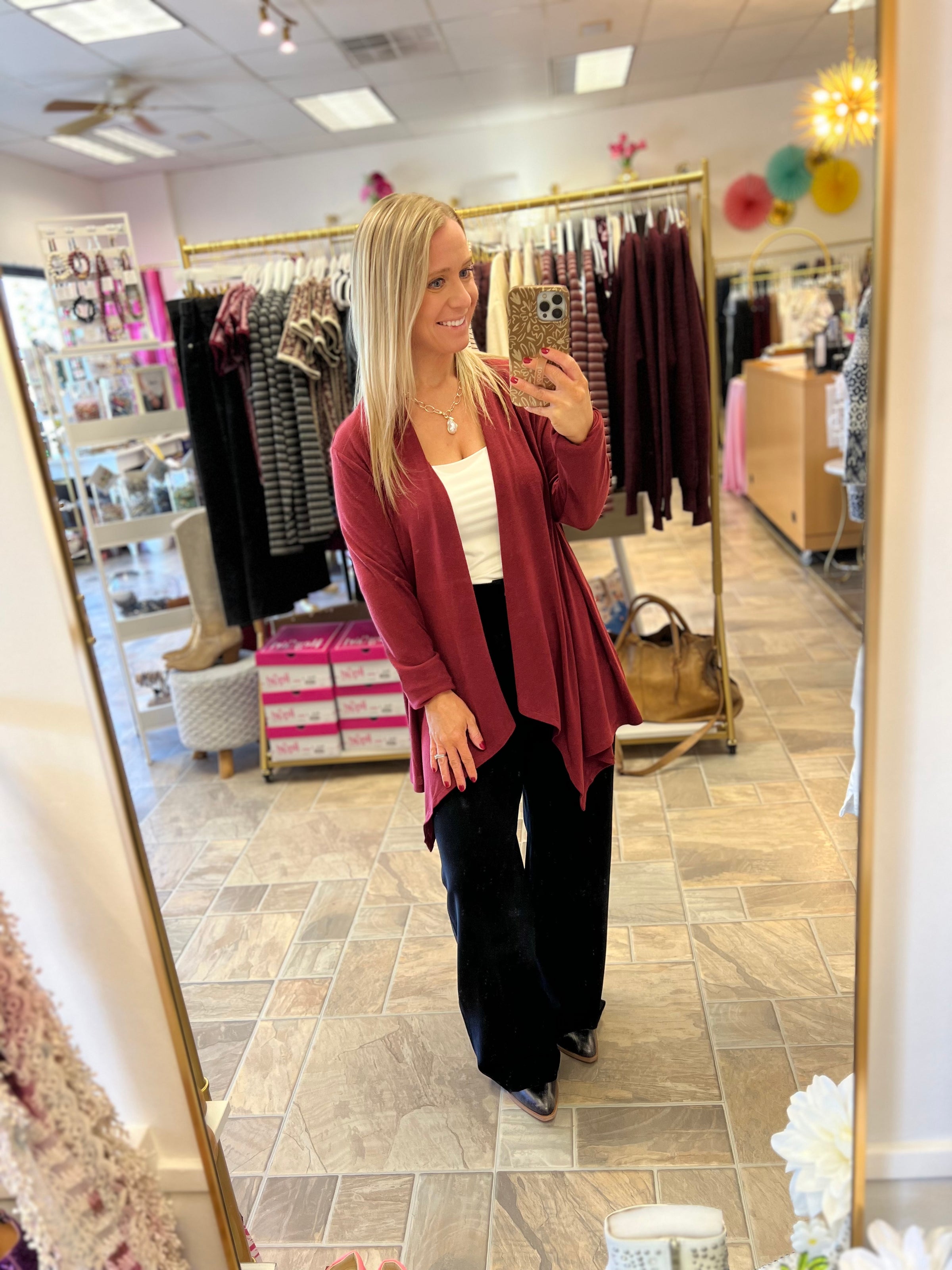 Wrap yourself in effortless elegance with the Soft Drape Cardi. Its waterfall-style open front adds a flowing, graceful touch to any outfit, while the lightweight hacci knit feels incredibly soft against your skin. Perfect for layering, this cozy yet chic cardigan makes staying comfortable stylishly easy.