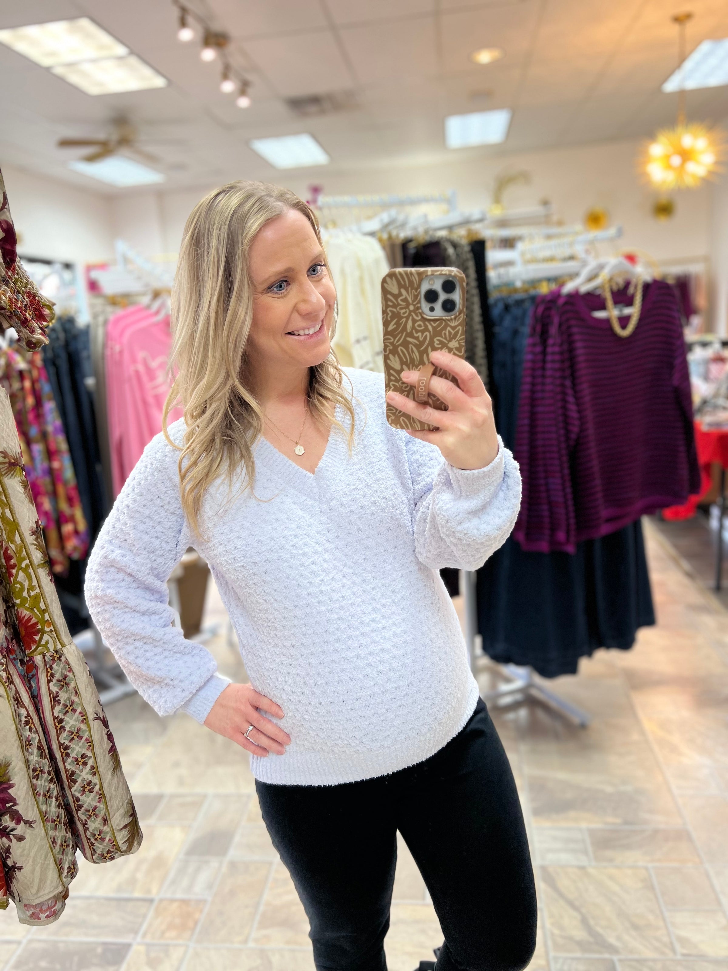 Wrap yourself in pure comfort with our Soft Cloud Sweater in dreamy Lavender Ice. This cozy pique knit features a flattering v-neckline that's perfect for layering or wearing solo. The gorgeous, soft-to-the-touch fabric feels like a gentle hug, while the beautiful lavender shade adds a touch of whimsy to any outfit. Whether you're lounging at home or stepping out for the day, this sweater is your new go-to for effortless style and snuggly warmth.
