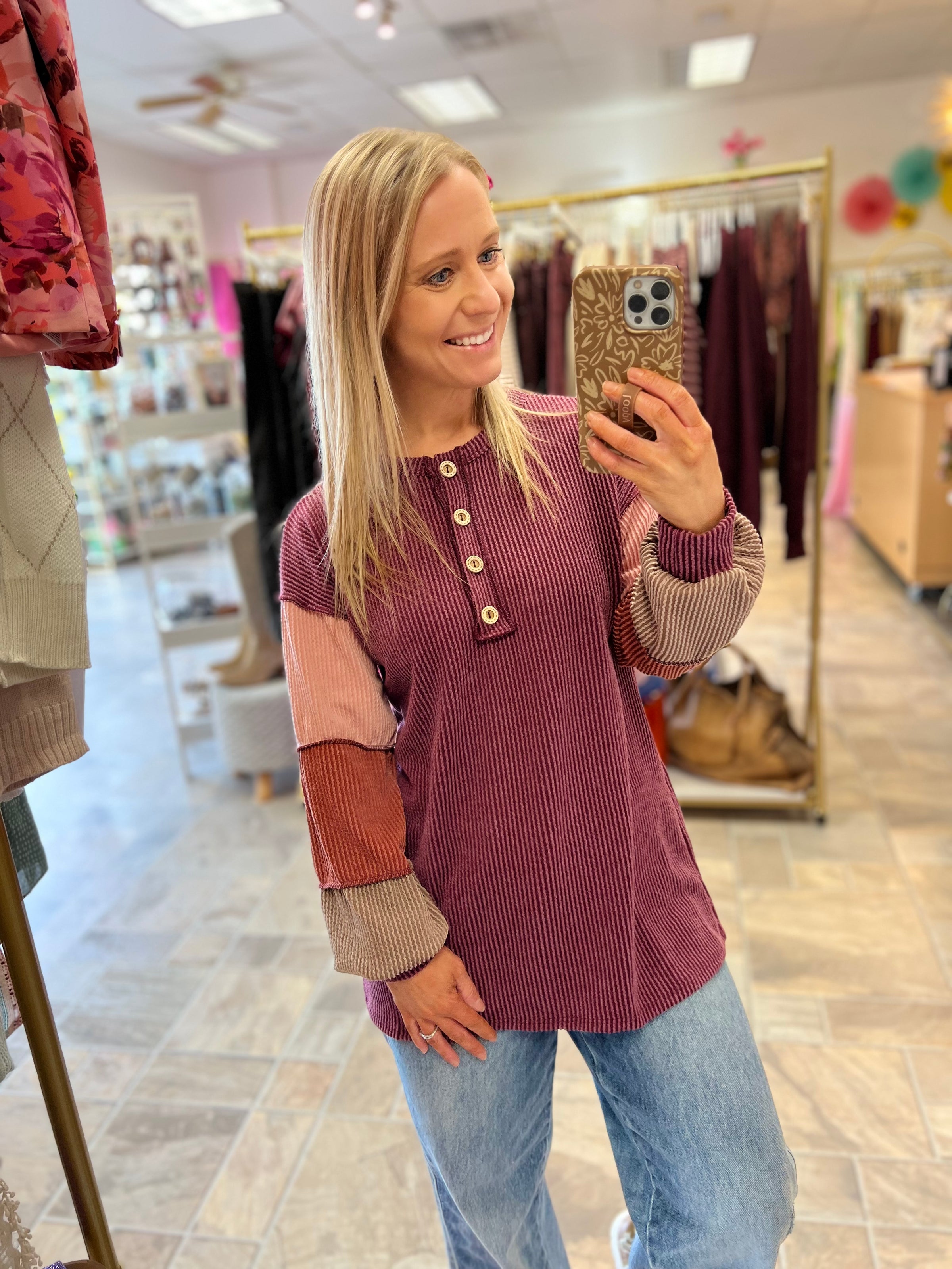 Add a pop of fun to your wardrobe with this Burgundy Colorblock Top. Featuring a playful mix of colors in a colorblock design, it sports a comfy round neckline and cozy ribbed fabric. The front button detail adds a charming touch, while the long puff sleeves bring flirty volume to your look. Perfect for stylish days that call for a little extra personality!