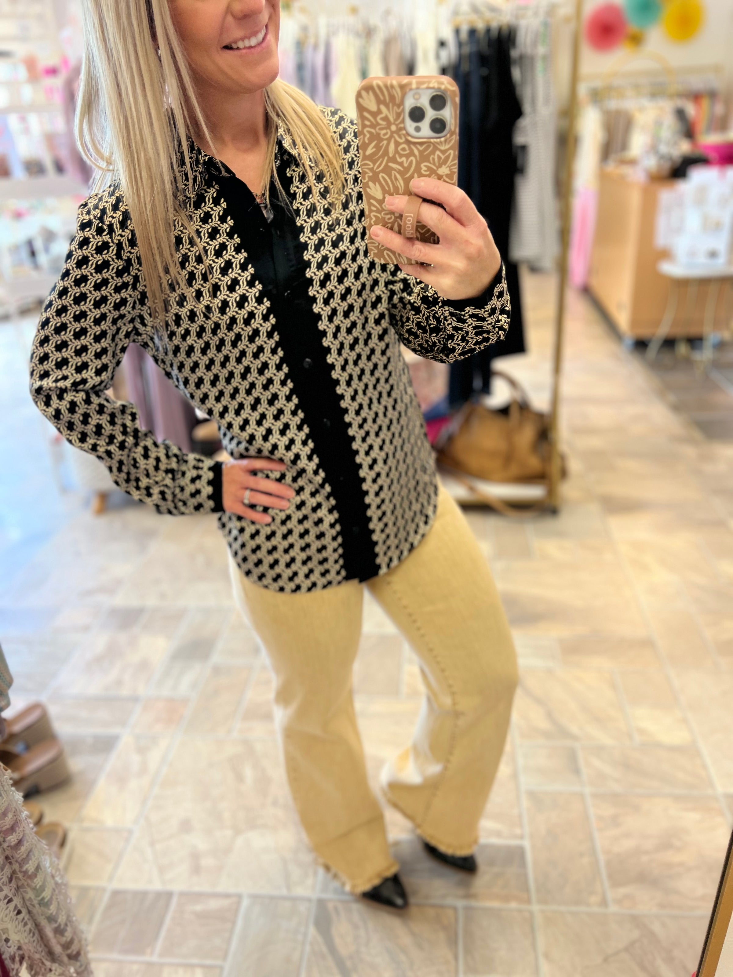 This button-front shirt makes a striking statement with its Black Gold Combo print, elegant and graphic, designed to be uniquely yours. Designed with a classic collar, curved hem, and subtle back pleat, it drapes effortlessly whether worn tucked, untucked, or layered under a jacket.